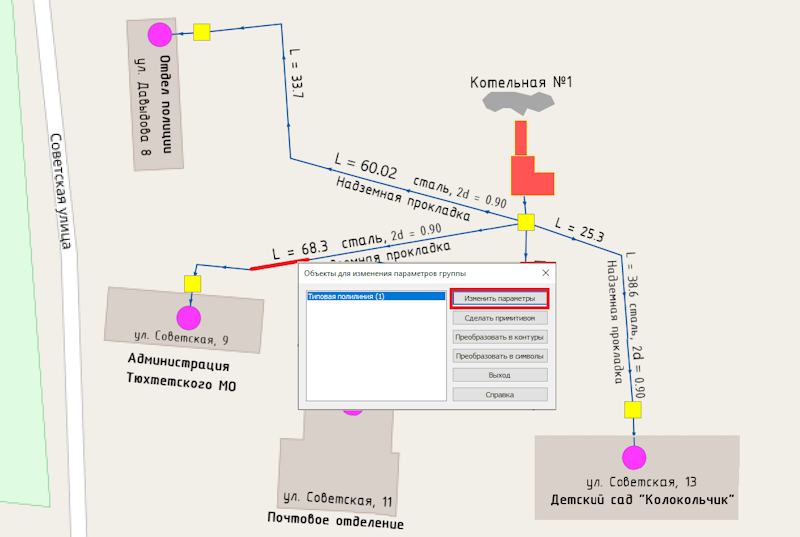 Рассмотрим на примере участка тепловой сети в с. Тюхтет от котельной № 1 подключено 4 объекта. Администрация Тюхтетского муниципального округа с. Тюхтет ул. Советская 9, Отдел полиции с. Тюхтет ул. Давыдова 8, Почтовое отделение с. Тюхтет ул. Советская 11, детский садик «Колокольчик» с. Тюхтет ул. Советская 13